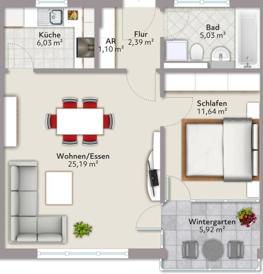 Das lichtdurchflutete Schlafzimmer mit direktem Wintergarten-Zugang sorgt für einen energiegeladenen Start in den Tag – Ihre Einrichtungsideen kommen hier voll zur Geltung.