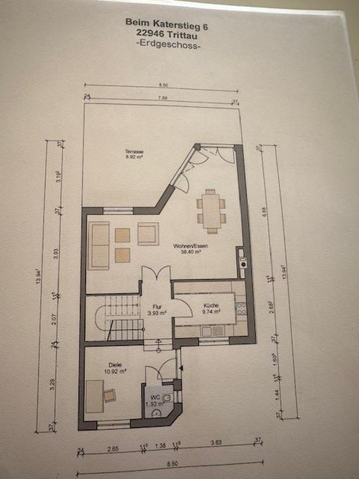 EG: Wohnraum / Essbereich (38,60qm), Küche (9,8qm), Büro (10,92qm), WC (1,92qm), Flur (3,93qm)