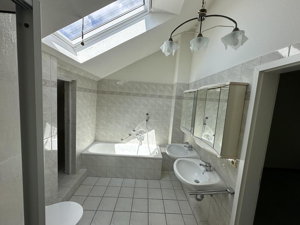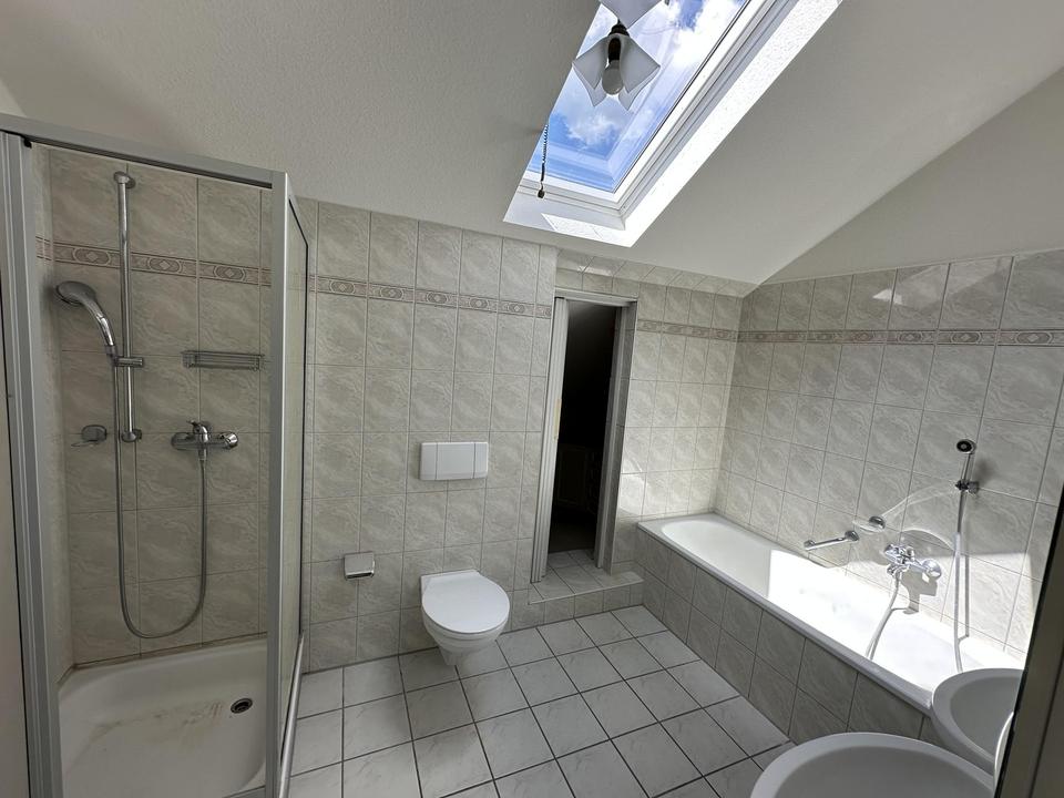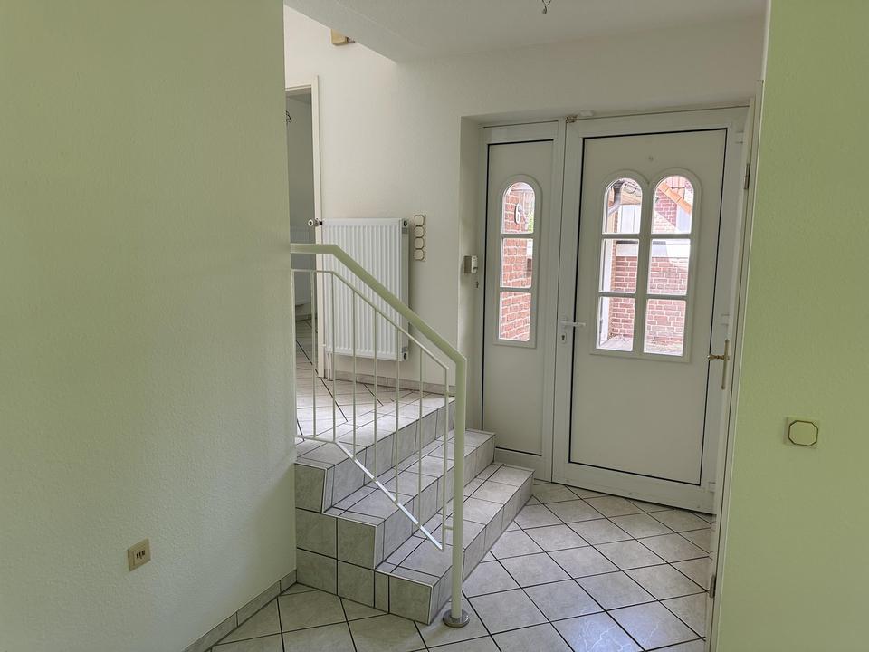 Der Fußboden im EG ist mit hellen Fliesen versehen und im Dachgeschoß