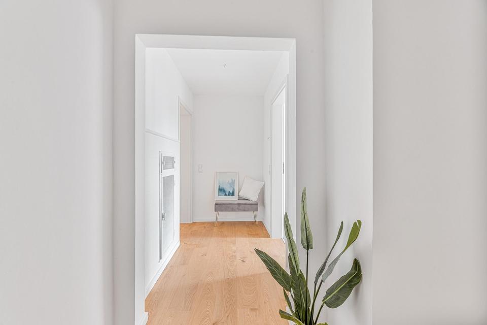 Bereits beim Eintreten wird der hochwertige Renovierungsstandard deutlich: Sämtliche Fenster und Türen wurden erneuert, ebenso alle Bodenbeläge. Frisch überarbeitete Wände und Decken sorgen für ein helles, zeitgemäßes Erscheinungsbild. Auch die Elektroinstallation wurde modernisiert – sämtliche Schalter und Steckdosen sind neu.