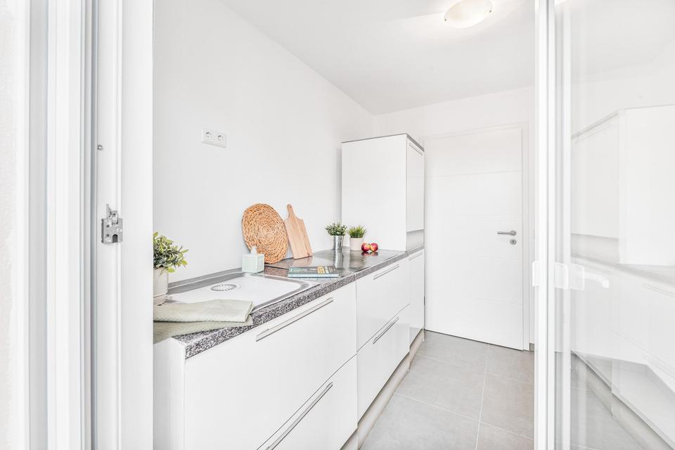 Der gut durchdachte Grundriss nutzt die Wohnfläche optimal. Der großzügige Wohn- und Essbereich bietet Zugang zu einem der beiden Balkone. Das Schlafzimmer verfügt ebenfalls über einen eigenen Balkon und schafft damit eine besonders angenehme Wohnatmosphäre. Küche und Badezimmer sind funktional geschnitten und bieten ausreichend Raum für individuelle Gestaltung.