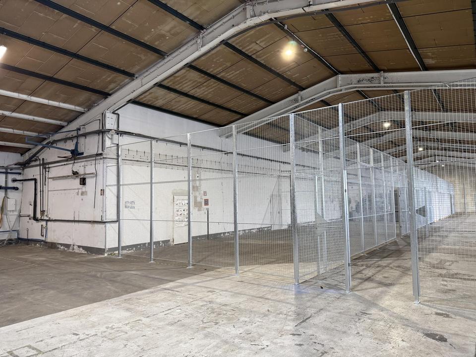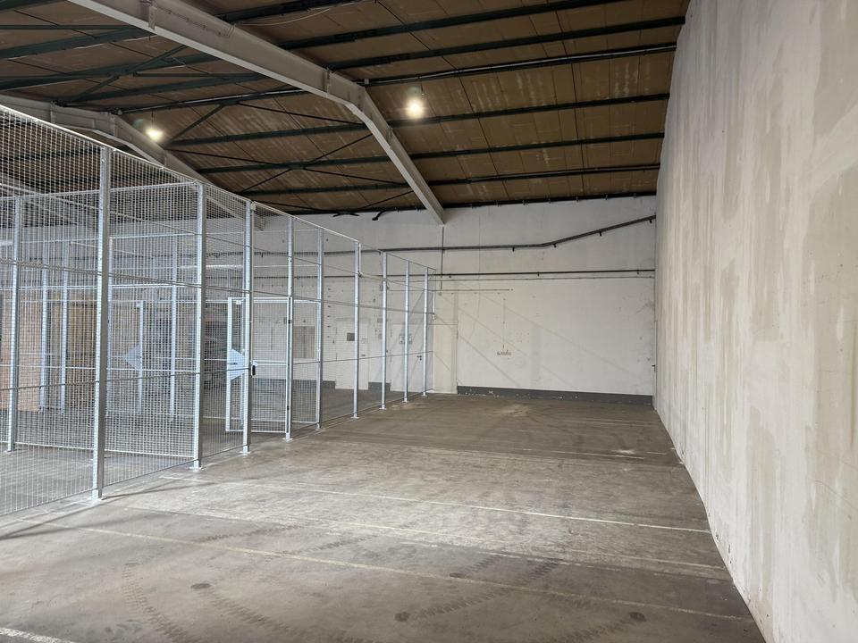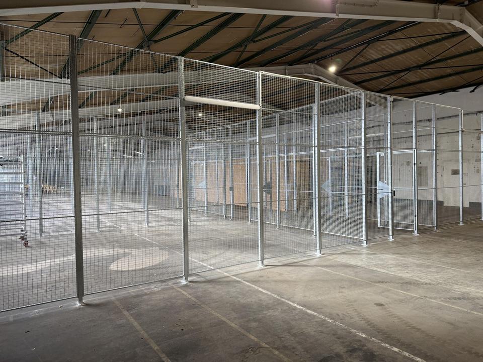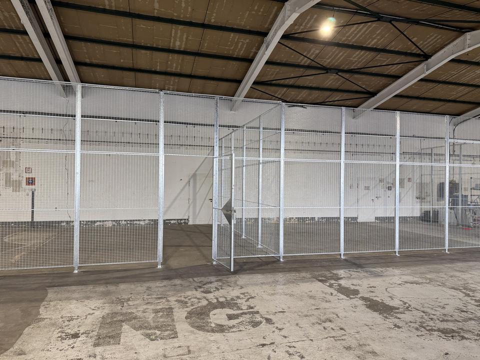 Die Storage-Boxen sind innerhalb der bestehenden Lagerhalle durch stabile, industrielle Gitterabtrennungen voneinander separiert. Die Abtrennungen bestehen aus robusten Stahlgitterelementen mit einer Breite von ca. 3.600 mm und einer Höhe von ca. 3.500 mm und gewährleisten eine klare Trennung der einzelnen Einheiten sowie eine gute Übersicht innerhalb der Halle. Die Ausführung ist auf den dauerhaften Einsatz im gewerblichen Umfeld ausgelegt.
