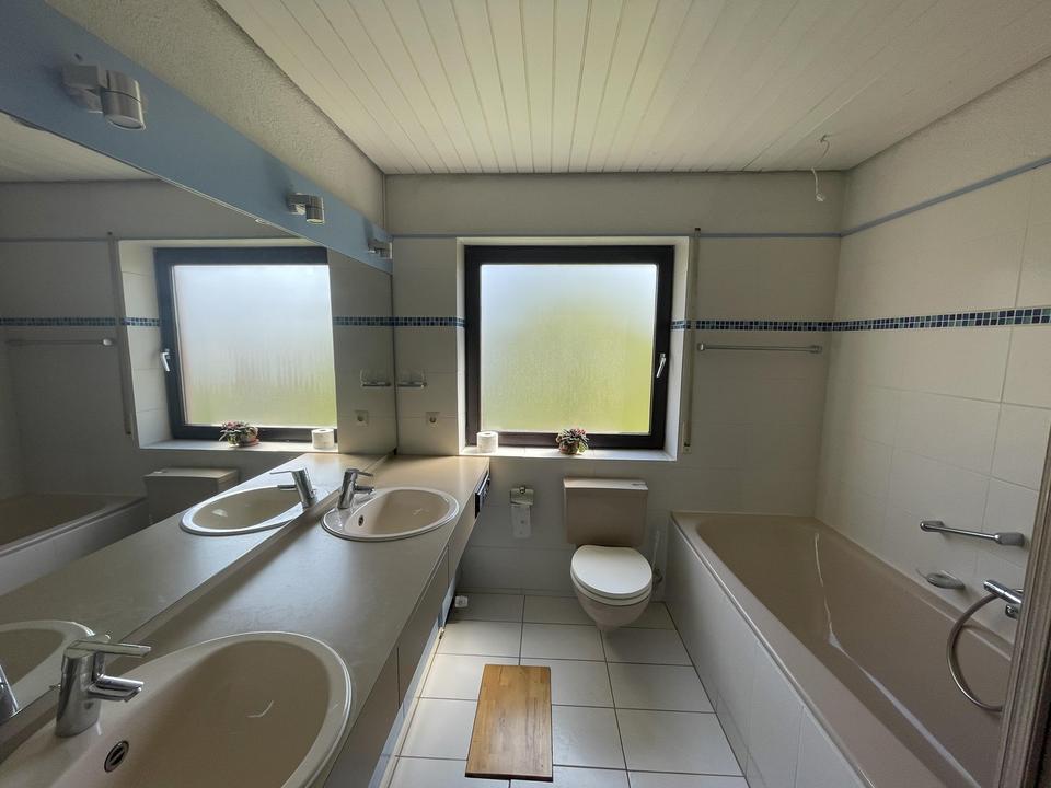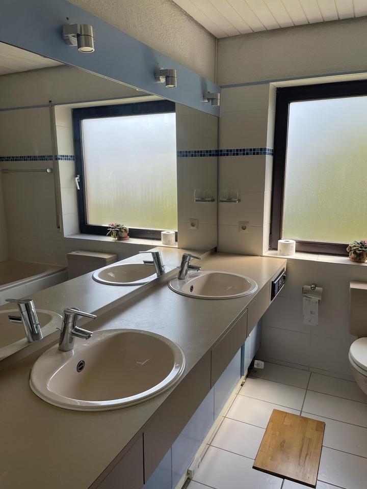 Das Badezimmer verfügt über alles, was man braucht: Dusche, Badewanne, 2 Waschbecken. Es wurde um das Jahr 2010 modernisiert.