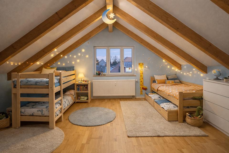 Das wunderschön ausgebaute Dachgeschoss mit offenen Dachbalken bietet zwei große, helle Schlafzimmer sowie ein modernes Badezimmer mit Dusche und schafft eine besonders wohnliche Atmosphäre.