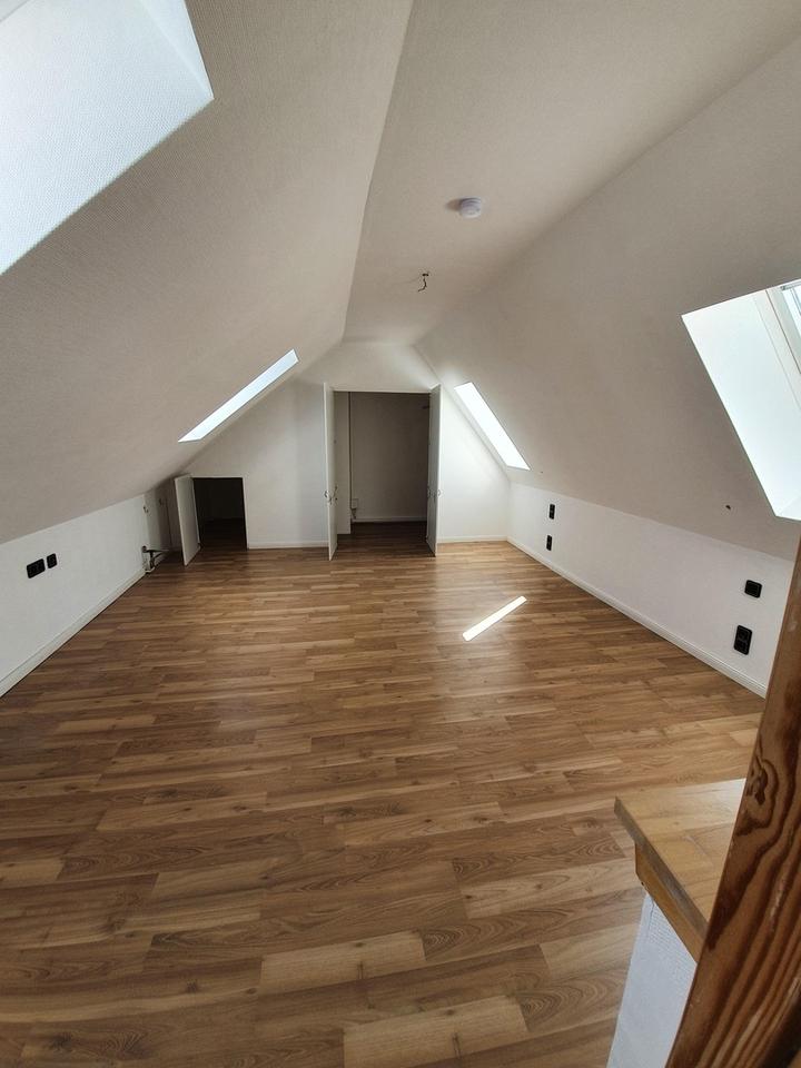 Im Maisonette-Stil führt von einem der Schlafzimmer eine massive Holztreppe in den ausgebauten Dachboden. Hier erwartet Sie ein weiterer Raum (ca. 20 m² Grundfläche), der bisher als Schlafzimmer oder Arbeitszimmer genutzt wurde und über einen begehbaren Kleiderschrank verfügt. Aufgrund der Dachschrägen wurde dieser Raum als 0,5-Zimmer angegeben.