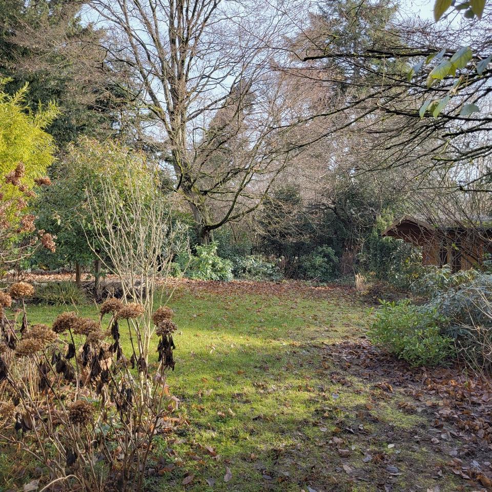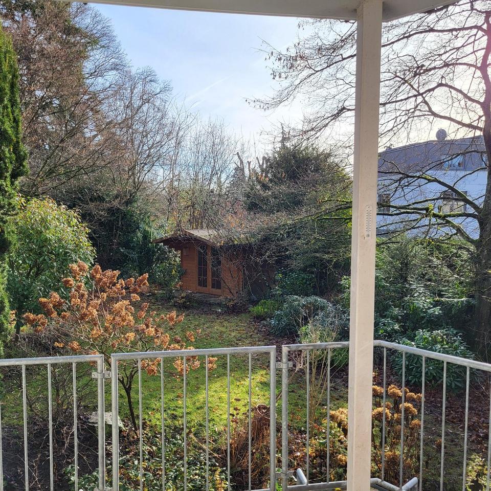 Vom Erdgeschoss führt eine überdachte Terrasse direkt in den wunderschön eingewachsenen Garten, der mit Gartenhütte und ausreichend Platz für Sitzgruppe oder Sonnenschirm zum Entspannen einlädt.