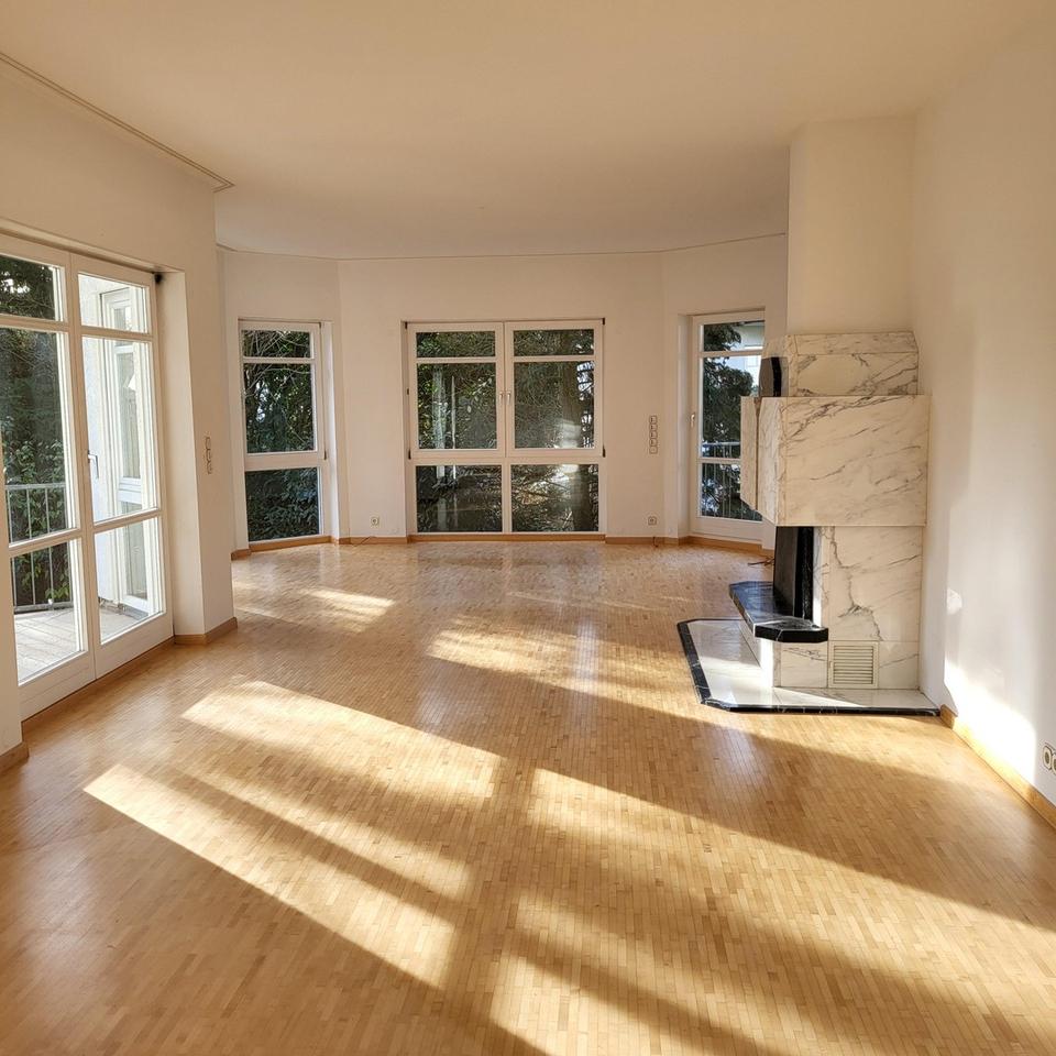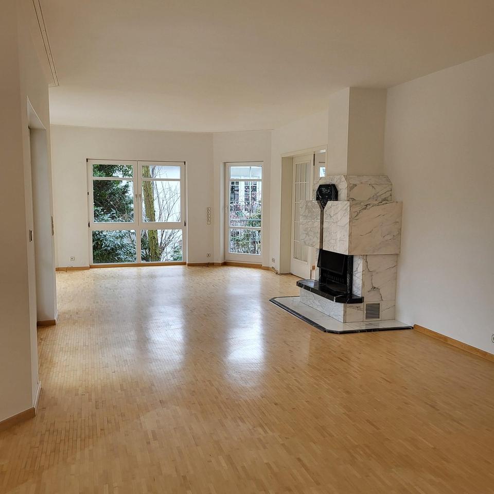 Im 1. Obergeschoss befindet sich der Haupteingang der Wohnung. Von hier gelangen Sie in einen einladenden, großzügigen Eingangsbereich mit Einbaugarderobe und Gäste‑WC. Eine elegante Flügeltür öffnet den Weg in das Herzstück der Wohnung: ein lichtdurchflutetes Wohn‑ und Esszimmer mit bodentiefen Fenstern, offenem Kamin sowie Zugang zu zwei überdachten Balkonen (Haupt- und Seitenbalkon). Angrenzend befindet sich ein weiterer Raum, ideal nutzbar als Bibliothek oder Homeoffice.