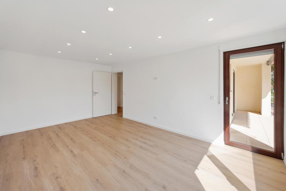 Der offene, lichtdurchflutete Wohnraum mit direktem Zugang ins Grüne lädt zum Entspannen ein. Große Fensterflächen sorgen ganztägig für eine freundliche und helle Atmosphäre, die das Raumgefühl noch größer wirken lässt.