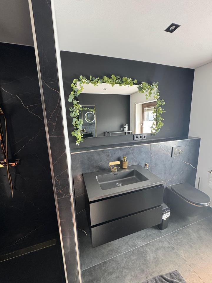 – Zwei luxuriöse Bäder (Master- und Gästebad) mit 3D-Wandfliesen in Schwarz-Gold, Whirlpool-Badewanne mit Bluetooth und Spiegel mit Wetteranzeige.