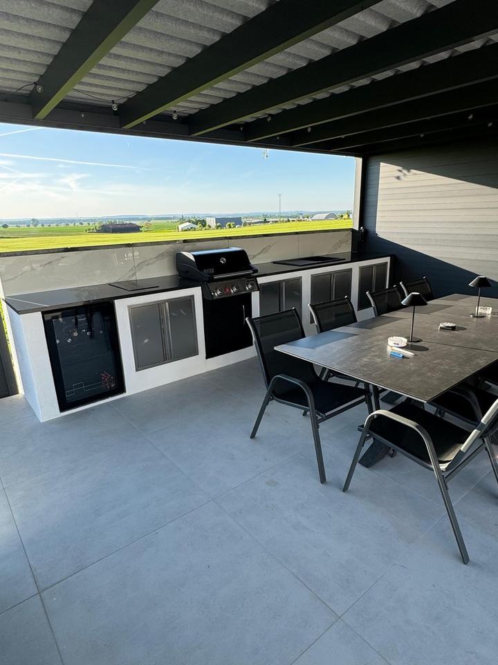 – Outdoor-Küche mit Weber-Grill, Spülbecken mit Warmwasser, Kühlschrank mit Beleuchtung, Steckdosen, Rollos, Glasabtrennungen und Beleuchtung.