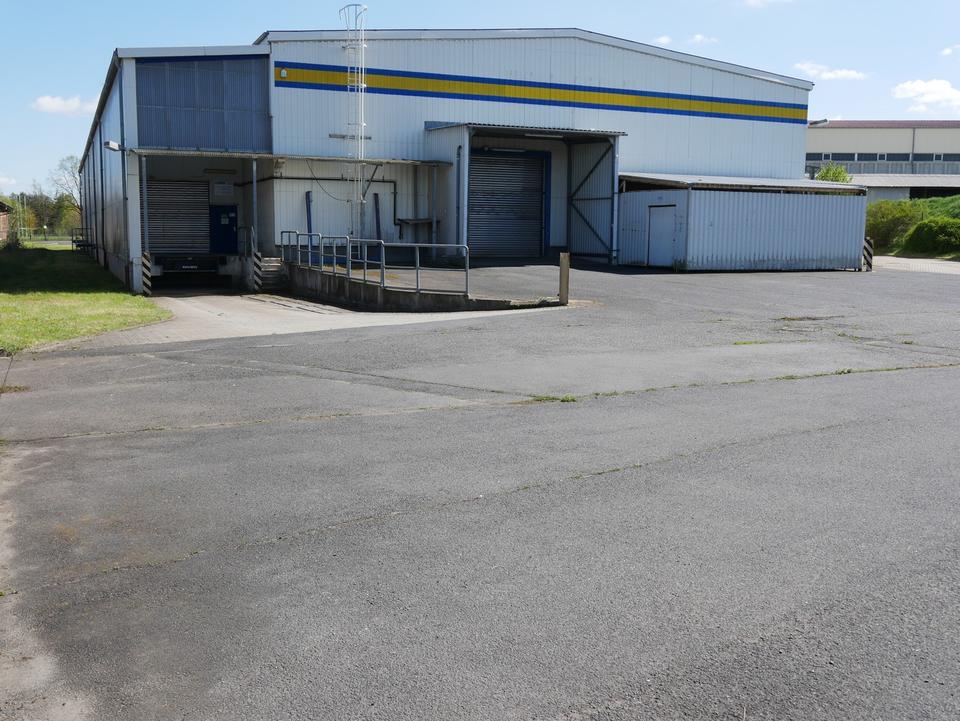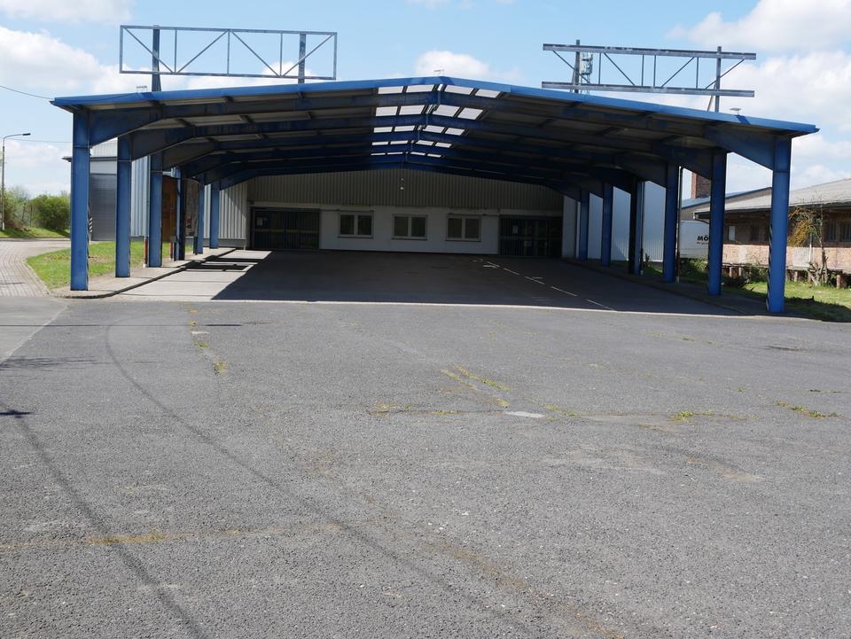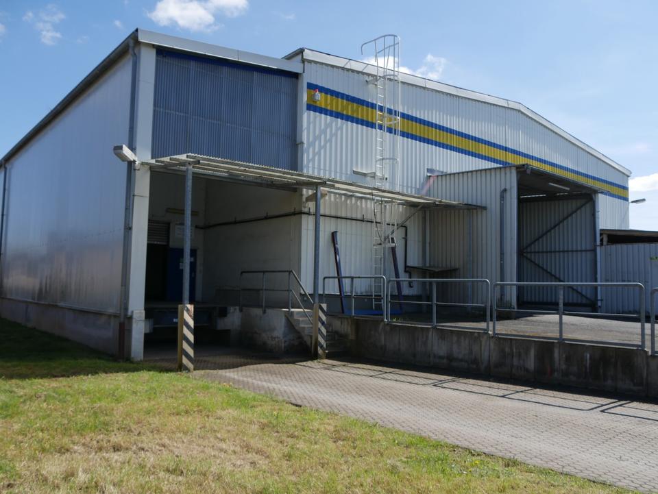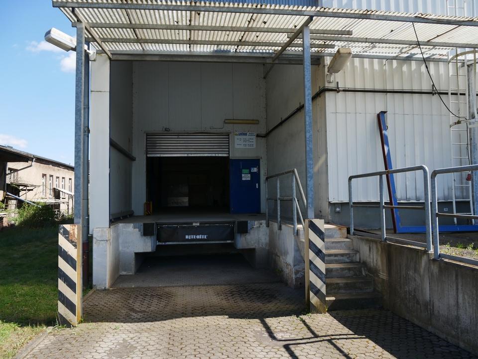 Auf der Rückseite befindet sich eine LKW Laderampe mit separaten Raum zum abstellen der Ware. Ebenfalls auf der Rückseite ist ein großes Rolltor zum befahren der Halle.