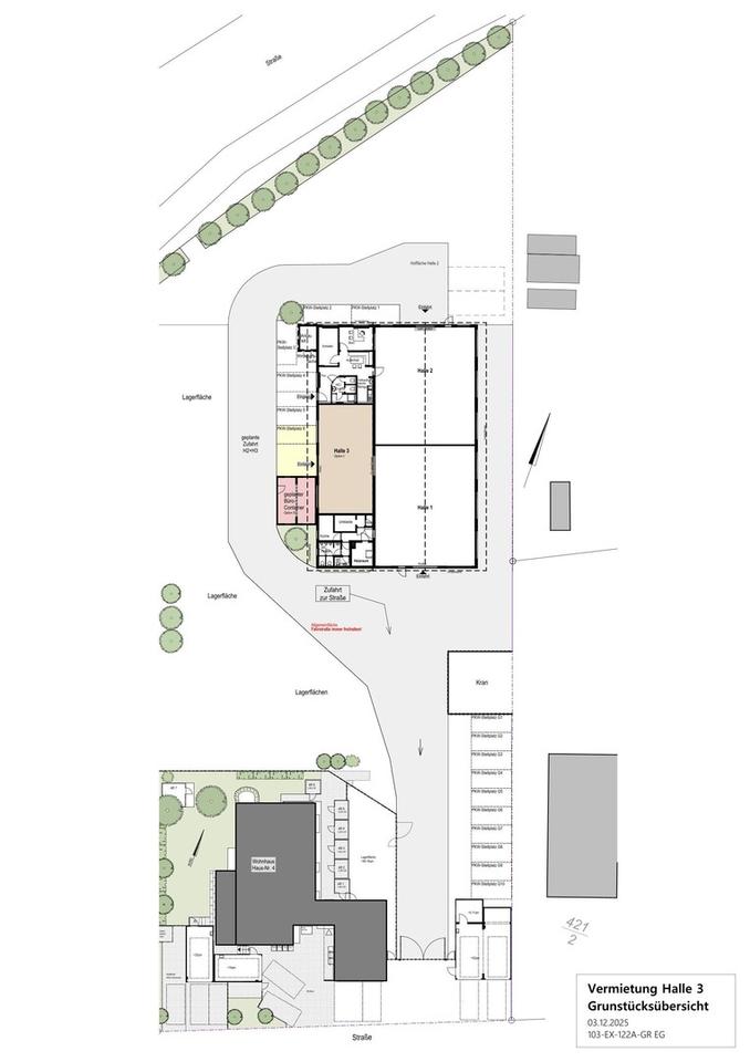 Zusätzlich kann ein Bürocontainer mit Wasser- und Stromanschluss, der direkt an der Halle steht, dazu angemietet werden. Weitere Freiflächen und/oder Stellplätze sind ebenfalls ergänzend anmietbar.