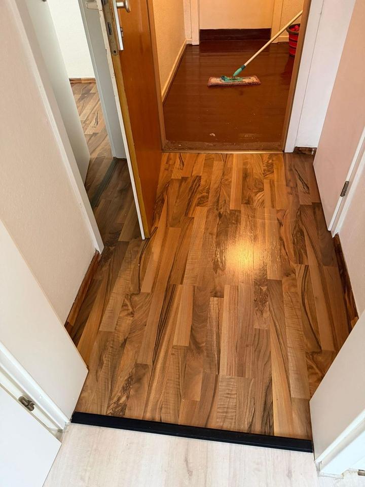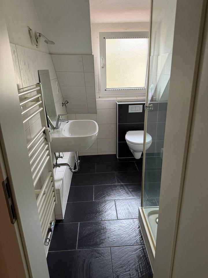 Das geflieste Bad mit Fenster verfügt über eine Dusche. Die gesamte Wohnung wurde weiß gestrichen und ist mit schönem Laminat versehen.
