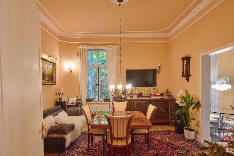 Auf der Bel Etage im 1. Obergeschoss wurden 2 Wohnungen verbunden, so dass eine Einheit mit gut 300 m² Wohnfläche und riesigem Südbalkon entstanden ist. Auch hier findet sich die ganze Pracht der klassizistischen Vergangenheit im Eichenparkett Fußboden und den reichen Stuckverzierungen an den 3,60 m hohen Wänden und Decken. Vom sehr großzügigen Wohnzimmer aus hat man direkten Zugang zur Südbalkon mit direktem Blick auf die herrliche Parkanlage. Des Weiteren finden sich auf dieser Etage zwei moderne Badezimmer, eine moderne und top ausgestattete Kücheninsel, ein elegantes Esszimmer sowie 5 weitere exquisite Wohnräume.