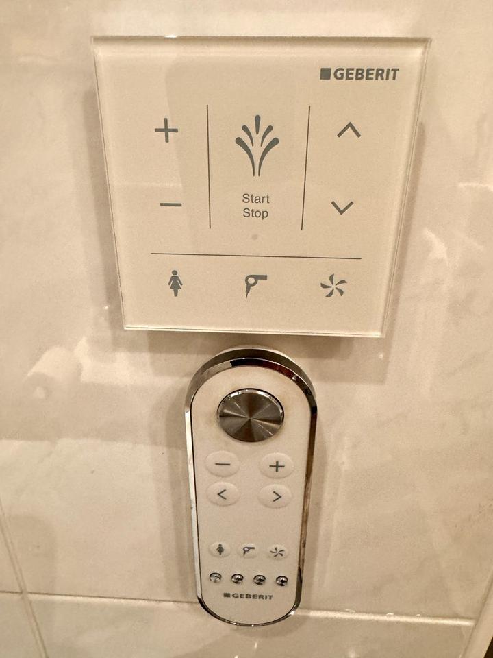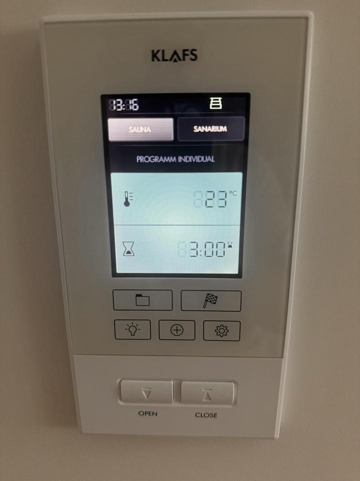 Ausziehbare, hochwertige KLAFFS-Sauna/Sanarium mit Spiegeltür Fußbodenheizung mit digitalen Funkthermostaten in allen Räumen Fußbodenheizung mit Energie aus nachhaltig erzeugter Fernwärme Wohnbereich und Schlafbereich klimatisiert