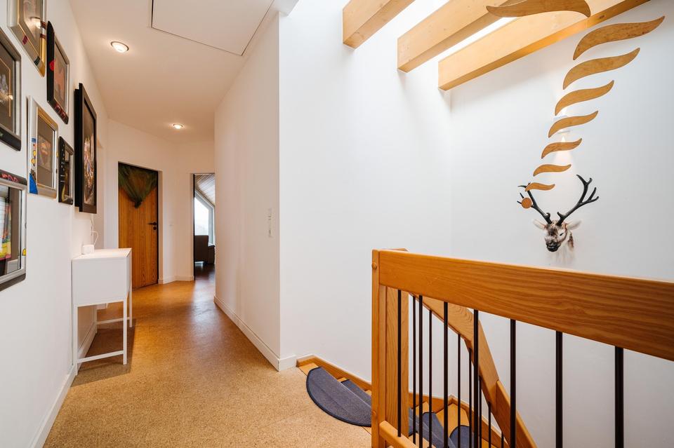Die zeitlose und gut ausgestattete Küche bietet viel Platz zum gemeinsamen Kochen und Backen. An sie schließt der Hauswirtschaftraum an, in dem sowohl Waschmaschine und Trockner, als auch Vorräte, Gefrierschrank und Regale untergebracht werden können.