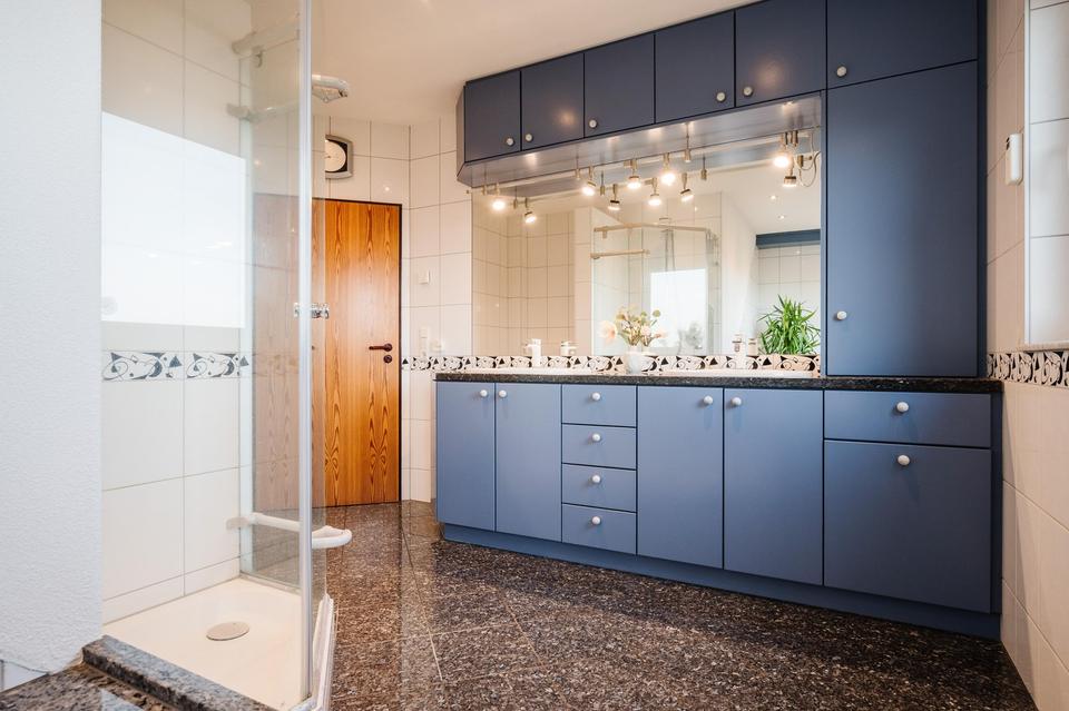 Das Dachgeschoss hat 3 Schlafzimmer, davon eines mit Ankleide, sowie ein großes Bad mit Badewanne, Dusche, WC, Doppelwaschbecken, Einbauschrank und elektr. Handtuchheizkörper.