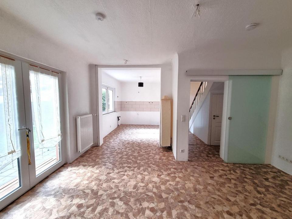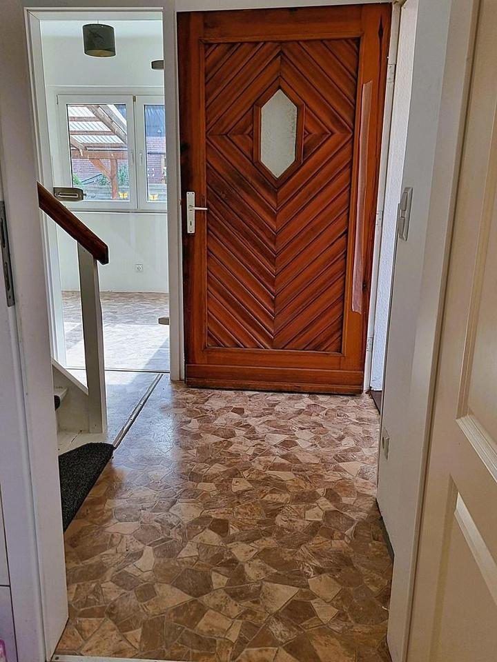 Erdgeschoss: Beim Betreten des Hauses gelangt man in einen hellen Windfang mit zwei Fenstern, Heizkörper und neu gefliestem Boden in dunkler Sandfarbe. Eine Massivholz-Haustür führt in den Flur. Links liegt ein helles Badezimmer mit neuem Sandfliesenboden und Fußbodenheizung; daneben führt eine Treppe ins Obergeschoss. Rechts befindet sich die offene Küche zum Flur abgetrennt durch eine Glastür, mit Westfenster. Am Ende des Flurs führt eine Glasschiebetür ins Wohnzimmer mit Terrassentür zur überdachten Terrasse mit Beleuchtung. Ebenfalls dort liegt das Schlafzimmer mit viel Nachmittagslicht. Neben der Schlafzimmertür befindet sich der Zugang zur Kellertreppe.