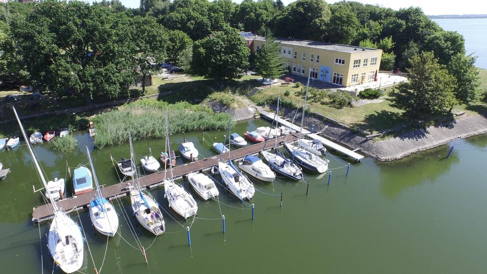 Auf dem Grundstück mit 14.000 m² befindet sich ein kleines Hotel mit 32 Gästezimmern, eine Privatstraße von ca. 80 m Länge, ca. 25 Parkplätze und ein Bootssteg mit 20 Bootsliegeplätzen (weiter ausbaubar) sowie Wiesen und Baumflächen.