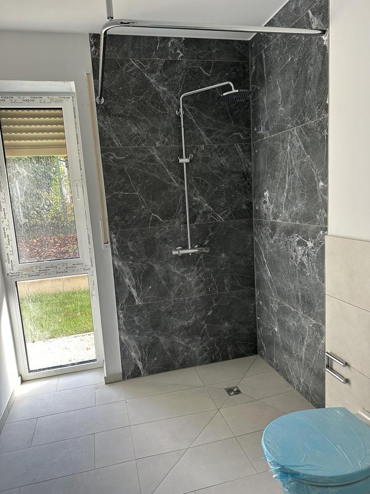 bodentiefe Duschen, gross, teilweise barrierefrei, bodentiefe Fenster, Fussbodenheizung, Palstring-Küchen