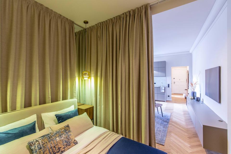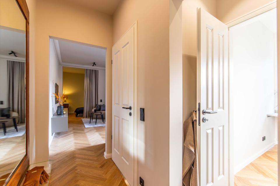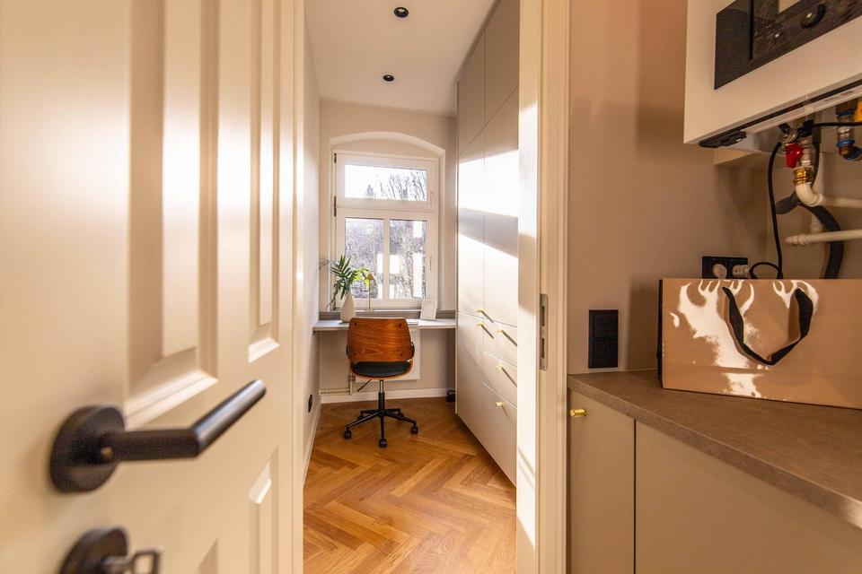 Diese außergewöhnlich hochwertig sanierte Designer-Altbauwohnung befindet sich im 4. Obergeschoss des Seitenflügels eines gepflegten Gründerzeithauses in der Winsstraße im Herzen des Prenzlauer Bergs. Die rund 45 m² große Wohnung ist sehr hochwertig ausgebaut und wurde von einer Innenarchitektin mit einem maßgeschneiderten Wohn- und Interior-Konzept ausgestattet. Es handelt sich um einen Erstbezug inklusive moderner Elektrik, neuem Fischgrät-Echtholzparkett, hochwertiger Sanitärinstallation, neuen Heizkörpern, exklusiven Einbauten sowie einer vollständig neuen, modernen Einbauküche. Der großzügige Wohnbereich überzeugt durch seine offene Raumwirkung, eine harmonische Farb- und Materialwelt sowie aufeinander abgestimmte Designer-Möbel, darunter ein hochwertiges Premium-Sofa, ein skulpturaler Esstisch, elegante Stühle, ein stilvoller Teppich und ausgewählte Leuchten namhafter Hersteller. Der Schlafbereich wurde durch ein dezentes, deckenhohes Vorhangsystem elegant abgetrennt und bietet mit einem neuen Polsterbett mit Bettkasten, passenden Nachttischen sowie hochwertigen Wand- und Deckenleuchten ein ruhiges, warmes und sorgfältig gestaltetes Ambiente. Die neue, unbenutzte Küche wurde maßgefertigt und fügt sich mit modernen Fronten, hochwertigen Elektrogeräten, integrierter Beleuchtung und maximalem Stauraum perfekt in den Wohnbereich ein. Das modernisierte Bad besticht durch klare Linien, ein zeitloses Farbkonzept und hochwertige Armaturen. Ein besonderes Highlight ist der separate Ankleide- bzw. Homeoffice-Bereich, ausgestattet mit raumhohen maßgefertigten Einbauschränken und einer integrierten Arbeitsplatte – eine in dieser Wohnungsgröße außergewöhnliche Kombination aus Stauraum und Funktionalität. Die Wohnung wird als komplett ausgestattetes Premium-Paket verkauft – inklusive sämtlicher Möbel, Leuchten, Vorhänge, Teppiche, Deko-Elemente sowie aller maßgefertigten Einbauten und der neuen Einbauküche. Hier wurde jedes Detail professionell geplant und umgesetzt, sodass ein sofortiger Einzug ohne weitere Investitionen möglich ist.