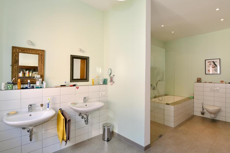 Im 2. OG befindet sich das großzügige und moderne Badezimmer, das umfangreich saniert wurde. Zur Ausstattung gehören eine bodengleiche Dusche, Badewanne, 2 Waschtische, 1 Toilette sowie Anschlüsse für Waschmaschine und Trockner. Die absolute Besonderheit ist ein aus dem 13. Jahrhundert stammendes Spitzbogenfenster.
