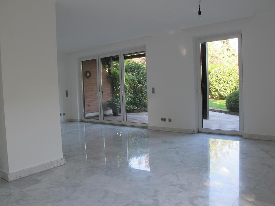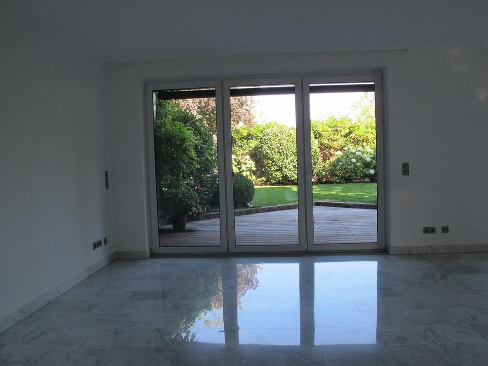 Bodentiefe Fenster sorgen für lichtdurchflutete Räume. Vom Wohnzimmer aus haben Sie Zutritt zur Terrasse in Süd-West-Ausrichtung und genießen den Blick in den besonderen Garten und den Weitblick über Hemer.
