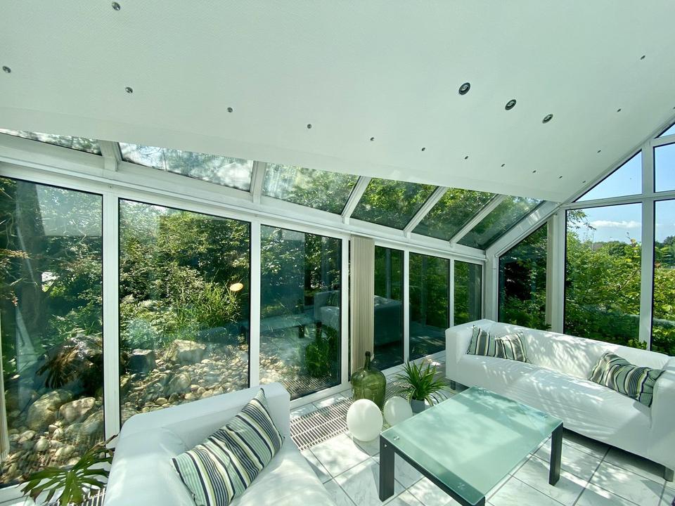 – Offener Wohn-, Ess- und Küchenbereich mit Wintergarten