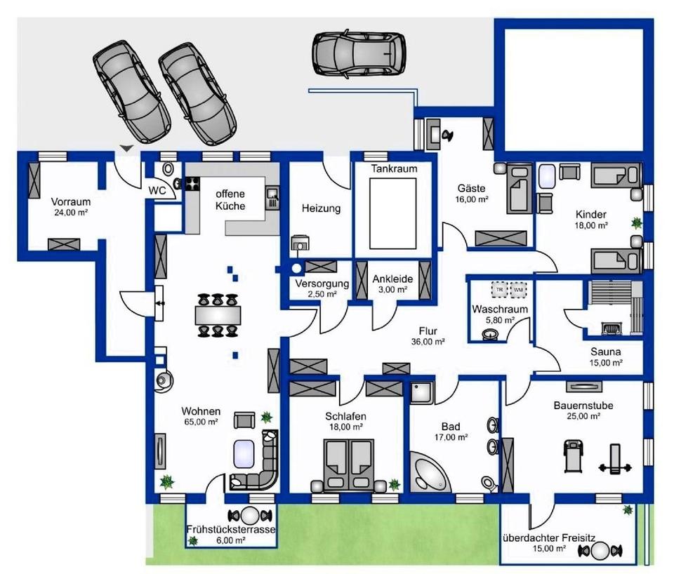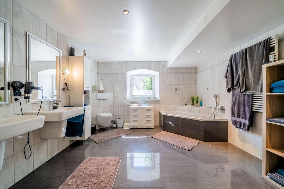 Drei ruhige Schlafzimmer schaffen Raum für Rückzug und Erholung. Ein hochwertig ausgestattetes 17 m² großes Badezimmer, ein Waschraum, ein Gäste-WC, eine separate Bauernstube und Sauna sowie drei Dielen unterstreichen das durchdachte Wohnkonzept. Ob Homeoffice-Oase oder Mehrgenerationenlösung, die Aufteilung lässt keine Wünsche offen.