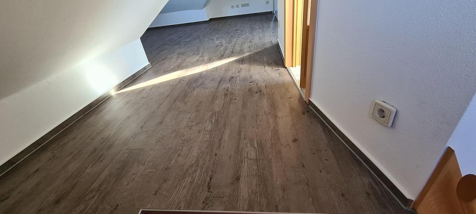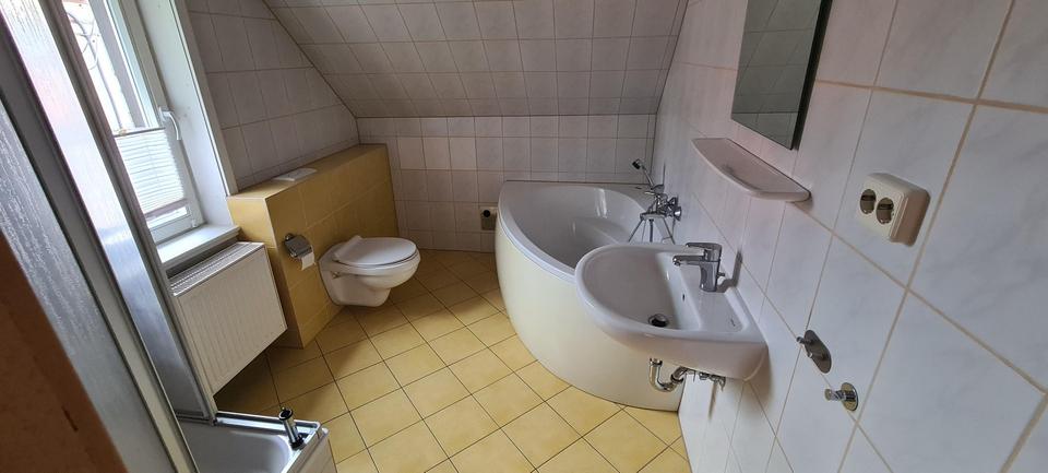 Im 1. OG befindet sich Parkett, im Dachgeschoss Laminat. Im DG befindet sich ein Gäste-WC. Das Bad und das Gäste-WC sind gefliest. Das große Bad im 1. OG verfügt über eine Badewanne und eine Dusche.