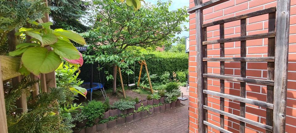 Neben der sonnigen großzügigen Terrasse steht ein zur Hauptstraße durch eine Hecke abgeschirmter Garten zum Relaxen und sicheren Spielen für Kinder zur Verfügung.