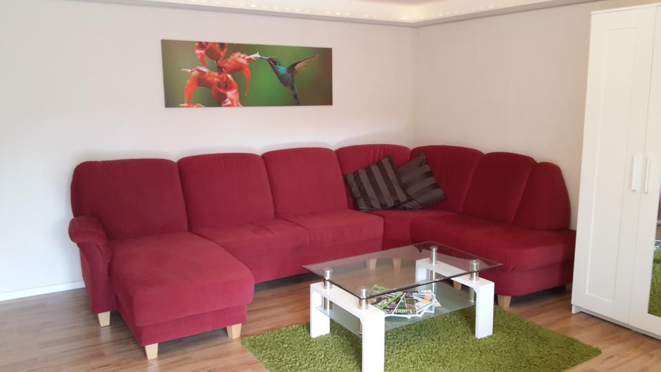 1 geräumiges Sofa in U-Form mit Beistelltisch und Teppich