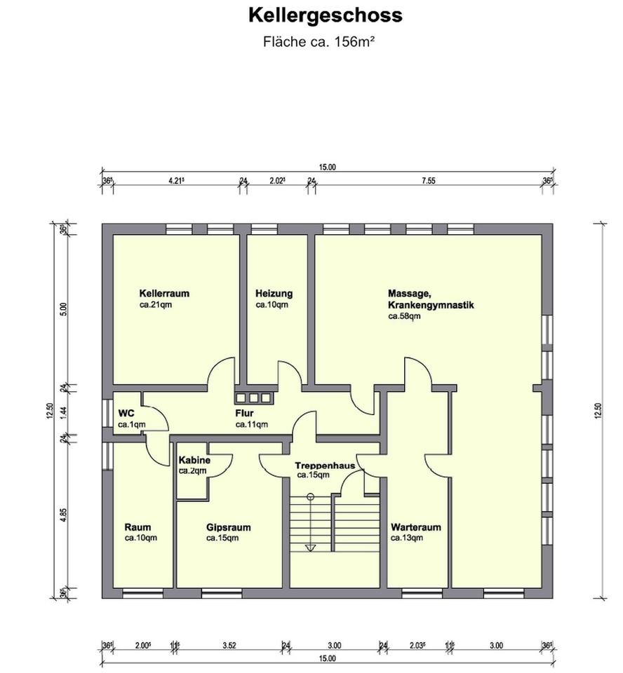 Früher waren in dieser Kellertage des Mehrfamilienhaus einige Räume der damals darüber liegenden orthopädischen Arztpraxis, eine Massagepraxis und später auch ein Nagelstudio untergebracht. Aktuell sind die Räumlichkeiten an einen Pflegedienst vermietet, der diese für Mitarbeiter und als Lagerfläche nutzt.