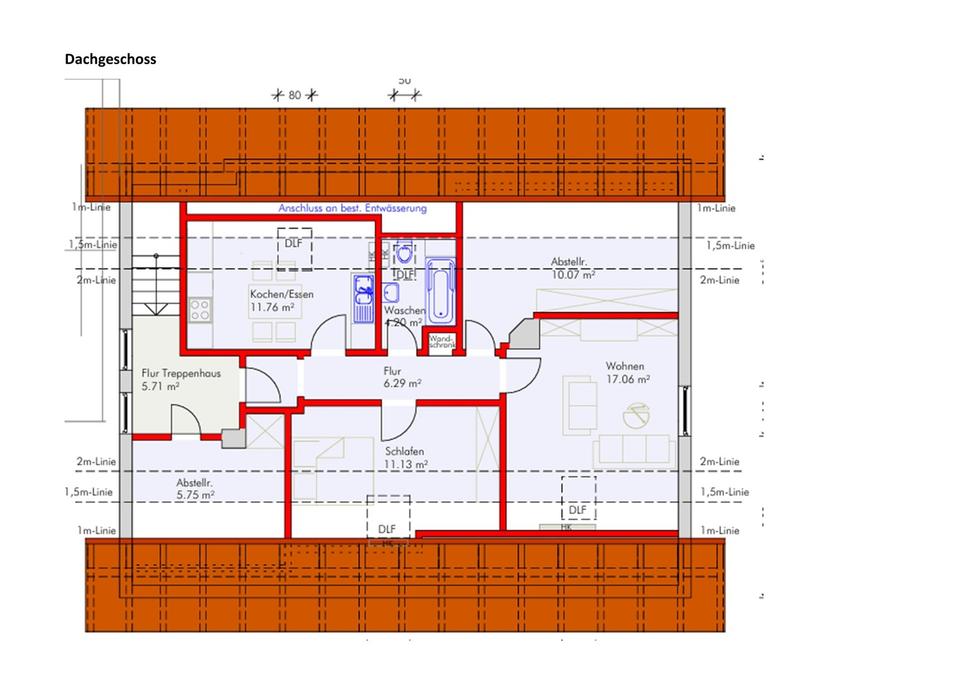 Das Dachgeschoss verfügt derzeit über ein Bad und 3 Schlafzimmer. Der Einbau einer Küche ist möglich, so dass hier eine weitere separate Wohnung abgetrennt werden kann.