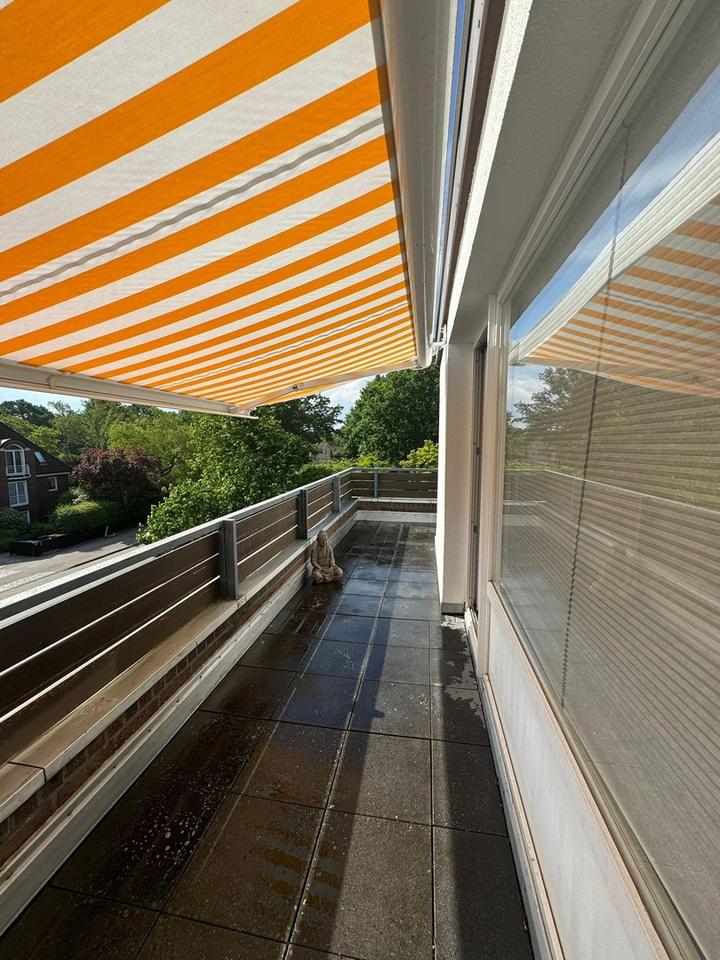 Die umlaufende Terrasse wurde ebenso vor kurzem saniert, neue Fliesen mit Untergerüst. Auf der Terrasse wurde vor 2 Jahren eine über 4m lange Elektro-Markise von MARKILUX installiert, mit elektrischem Bedienschalter unter Putz im Wohnzimmer.