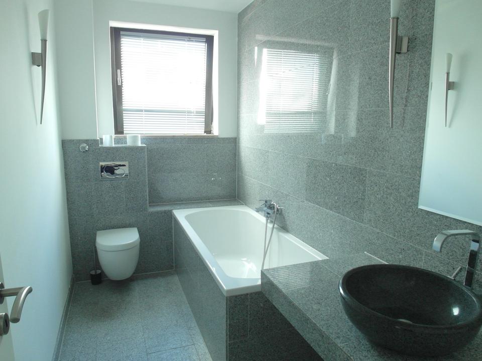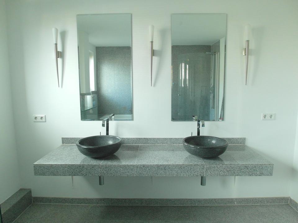 Die Bäder sind mit rutschfesten Granit-Fliesen ausgestattet. Die Design-Waschbecken bestehen aus massivem Granit.