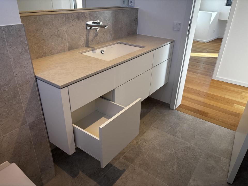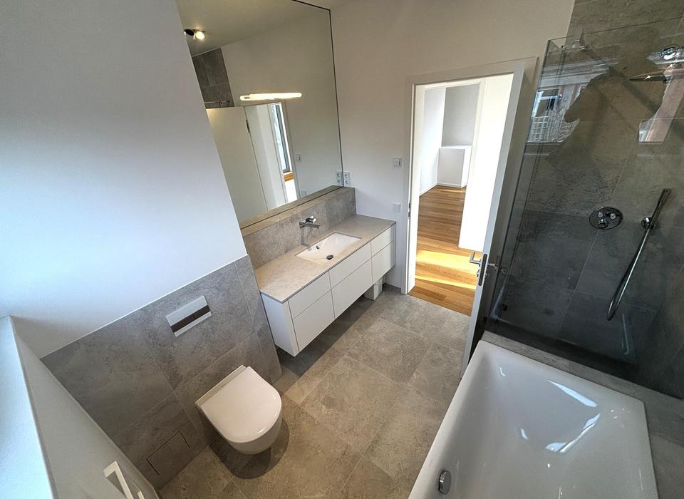 HAUPTBAD (6,58 qm, bodengleiche Dusche, Wannenbad, massgefertigtes wandhängendes Waschtischmöbel [mit fünf Schubkästen mit Tip-On-Öffnung, Deckplatte Silestone Nolita Suede matt, Unterbauwaschbecken], Sanitärkörper Kaldewei Silenio, Armaturen Grohe Lineare, Handtuchheizkörper Kermi Casteo)