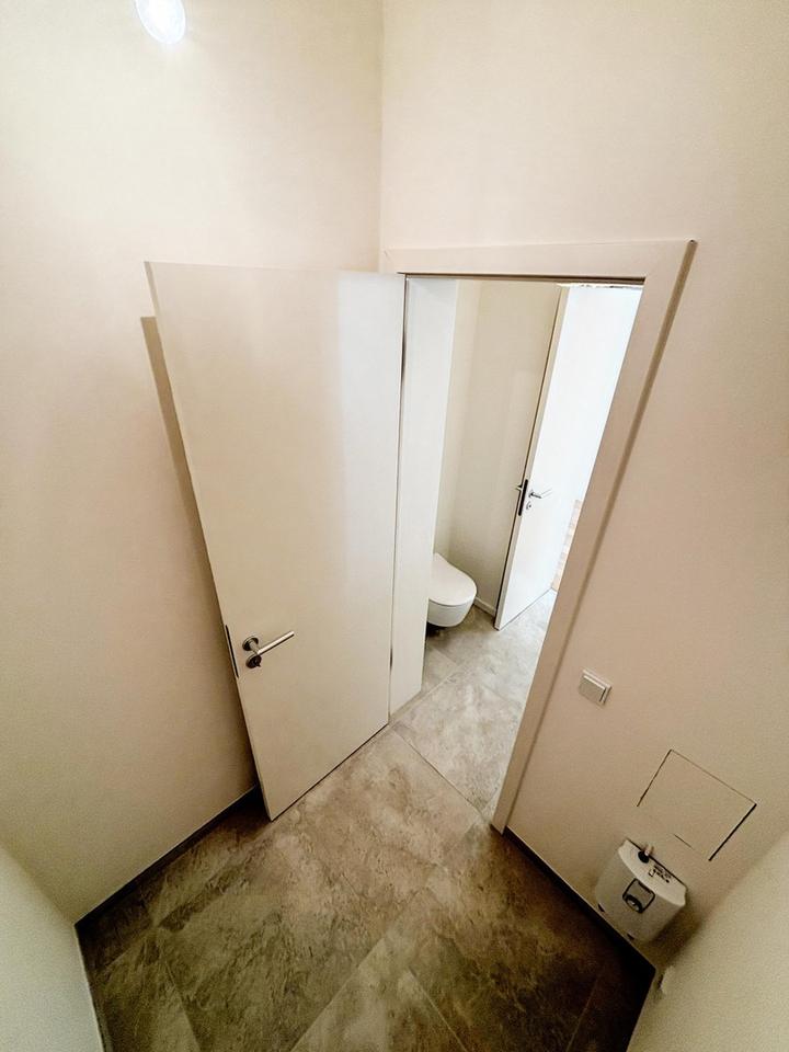 Vom Drei-Parteien-Treppenhaus betreten Sie im OG die Wohnung über eine lichte, konkav zulaufende DIELE (7,78 qm, raumhohes französisches Fenster). Die Diele erschließt in dieser Etage einen großzügig wirkenden ARBEITS- ODER SCHLAFRAUM (14,49 qm, über Eck laufende Fensteranlage) sowie ein innenliegendes GÄSTE-WC und einen ABSTELLRAUM.