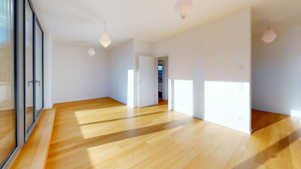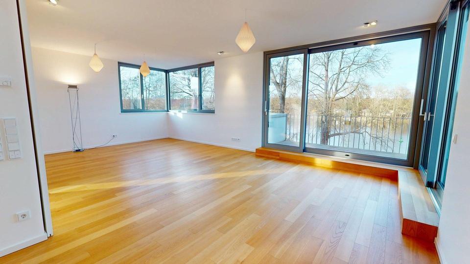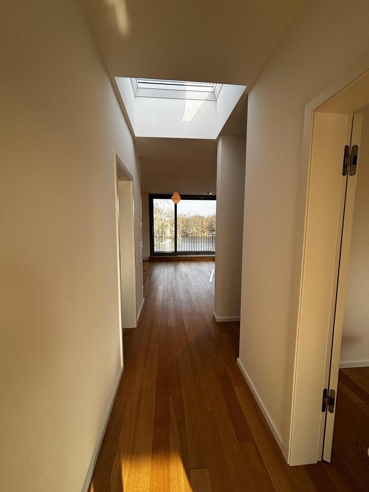 Penthouse-Maisonette-Wohnung im Dreifamilienhaus mit umlaufender Belichtung und 180 Grad unverbaubaren Ausblick auf die Spree-Landschaft und straßenseitig auf eine kleine Park-Anlage. Natur und trotzdem alles ganz nah: 700 m zur S-Bahn-Station und dann 30 min bis zum Potsdamer Platz.
