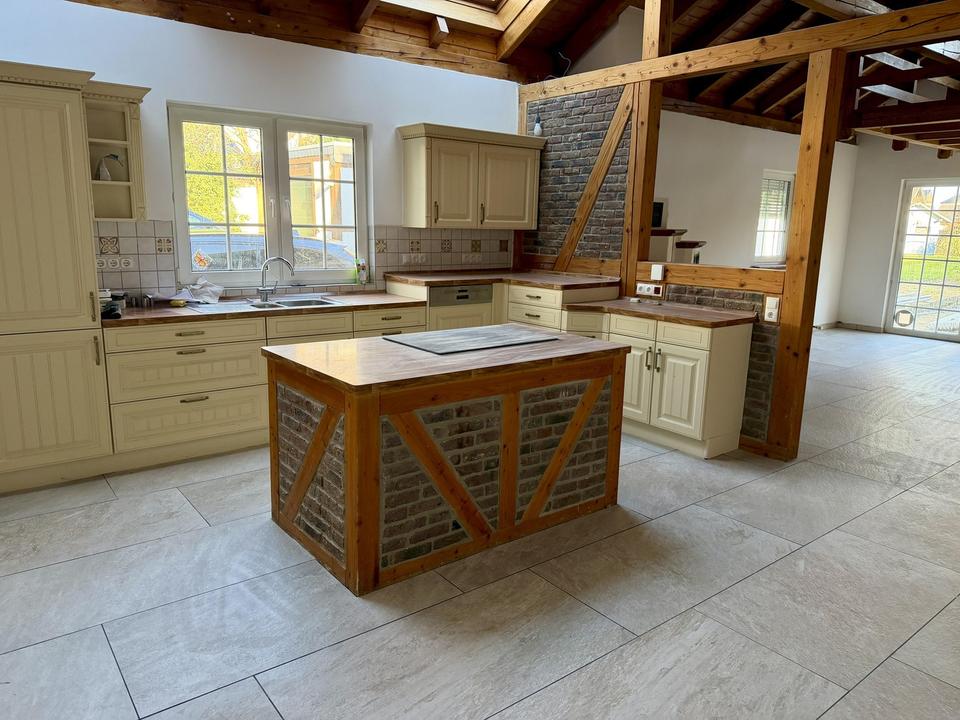 Der Garten liegt nach hinten mit Blick ins Grüne und geschützt vom Strassenlärm. Genießen Sie die frische Luft und die Natur. Entspannen oder Sonnenbaden Sie hier und nehmen Mahlzeiten im Freien ein. Eine wunderbare Erweiterung des Wohnraumes unter freiem Himmel. Es ist eine Landhausstil-Küche mit Kochinsel eingebaut mit allen E-Geräten.