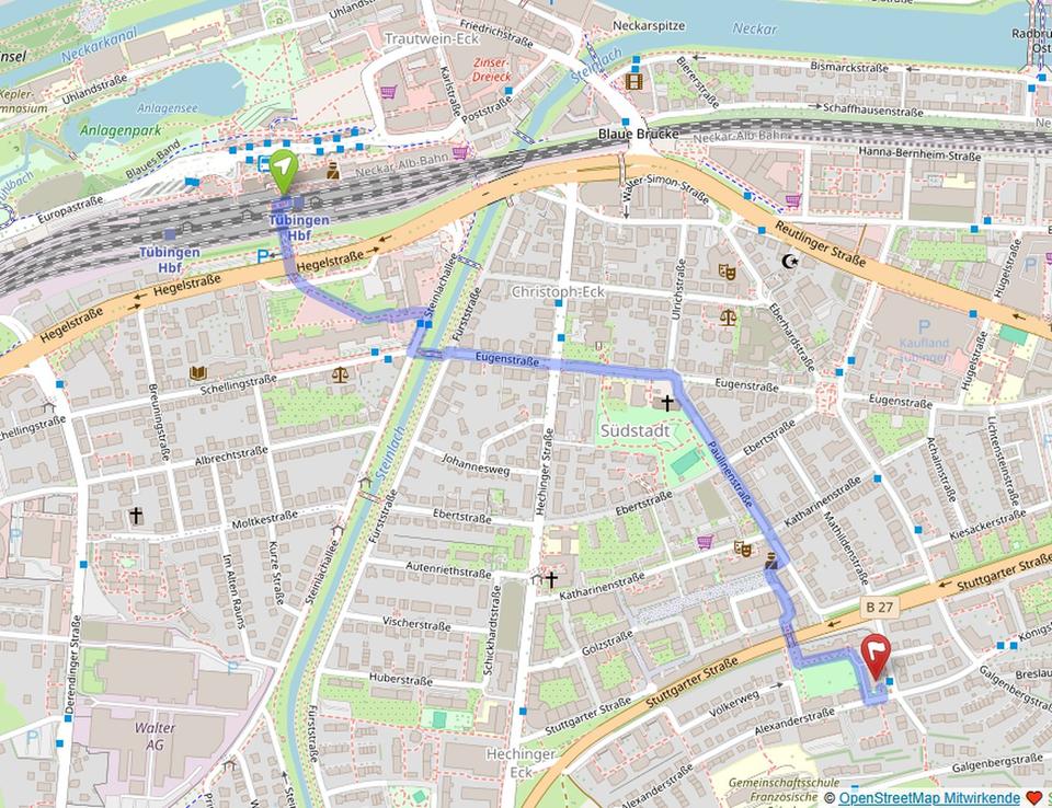 Die Wohnung liegt auf dem Galgenberg in der Tübinger Südstadt, direkt neben dem Französischen Viertel. Zum Fuß zum Tübinger Hauptbahnhof sind es 1,3 km. Drei Buslinien haben ihre Haltestellen wenige Meter vom Gebäude entfernt. Die Bundesstraße Richtung Stuttgart & Reutlingen erreicht man ohne das Tübinger Stadtgebiet zu durchqueren. So kann der Flughafen Stuttgart in 23 Minuten mit dem Auto erreicht werden.