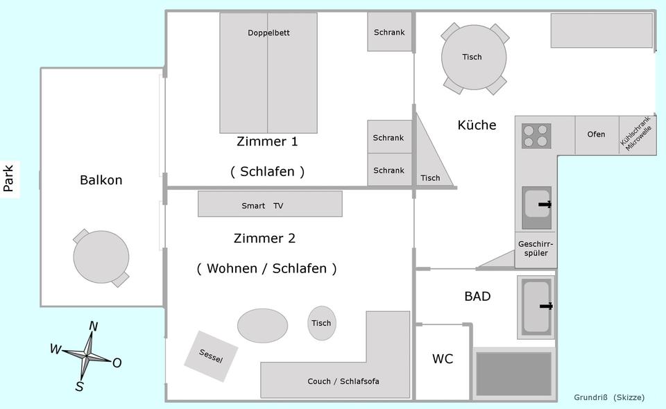 Optional könnten Sie den Grundriss der Wohnung verändern, denn alle inneren Wände dieser Wohnung sind nicht fest mit dem Fußboden verbunden und beherbergen auch keine Leitungen. So wäre es möglich, mit wenig Aufwand ein kleines Schlafzimmer und eine große Wohnküche mit Kochinsel zu realisieren. Die elektrischen Anschlüsse für die Kochinsel sind im Boden und in der Decke bereits vorgesehen. Diesen zweiten möglichen Grundriß finden Sie bei den Bildern skizziert.
