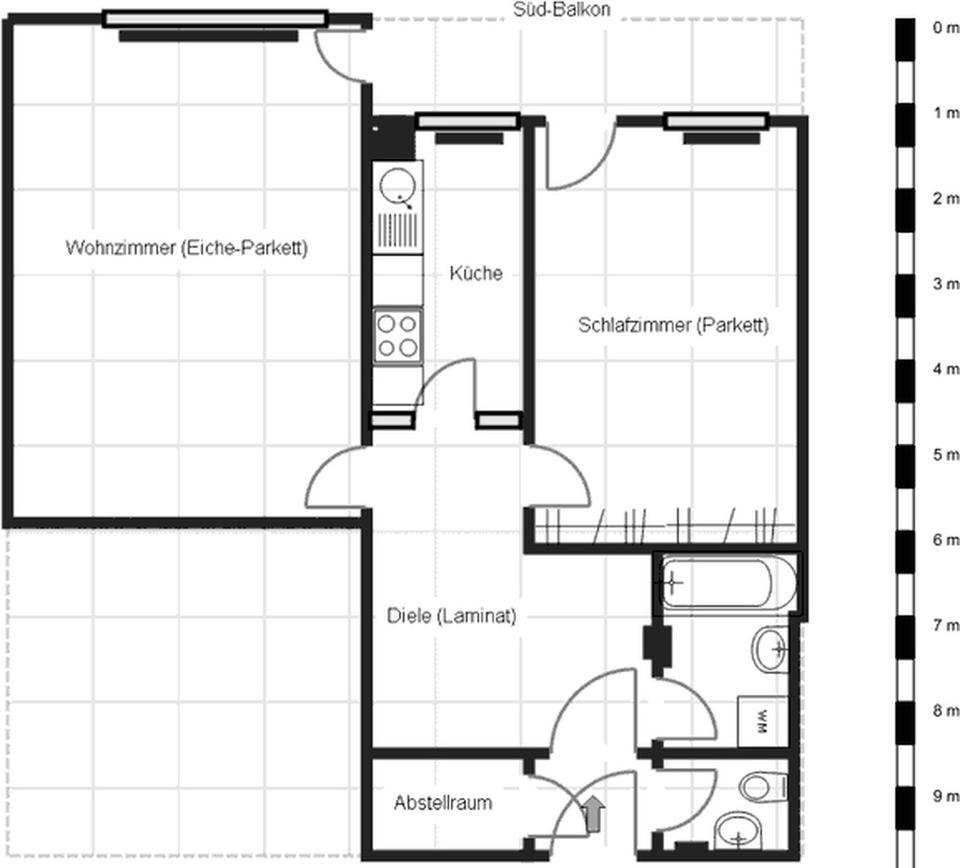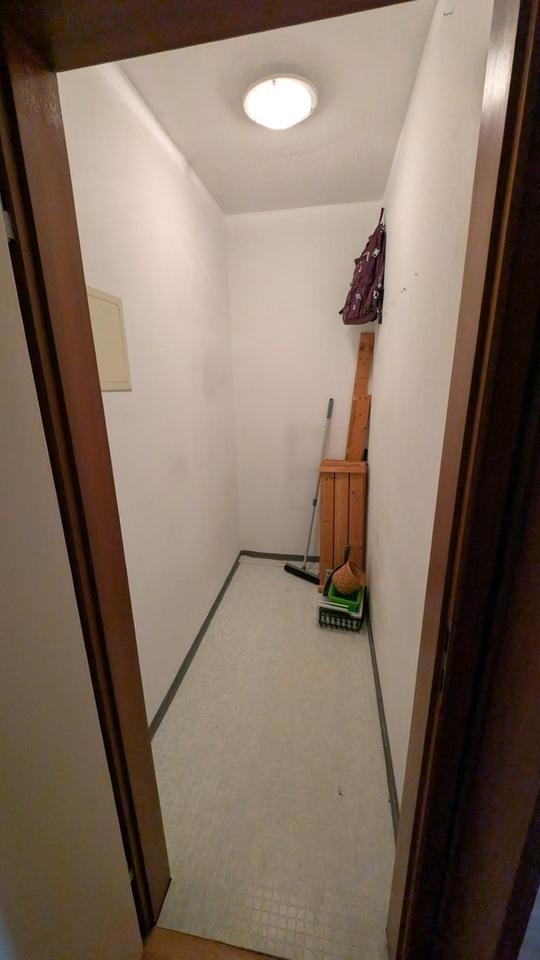 Zwei Abstellräume lassen ausreichend Platz zum Verstauen von Haushalts- und Lebensmitteln sowie als Garderobe. Das Schlafzimmer hat Platz für ein großes Doppelbett, Kommode und 4 Meter Kleiderschrank sowie einen Ausgang auf den fast 30 Meter langen, ca. 1,2 Meter tiefen Balkon, der sich über die südliche Sonnenseite und die Westseite erstreckt, auf der man mit einem Getränk die Nachmittags- und Abendsonne bis nach deren Untergang genießen kann. Dann sorgt eine Betonwand, die sich im Laufe des Nachmittags aufheizt, im Sommer noch einige Stunden für angenehme Rückenwärme. Vormittags genießt man dann den Schatten auf der Westseite, nachmittags lässt es sich auf der Südseite gut aushalten.
