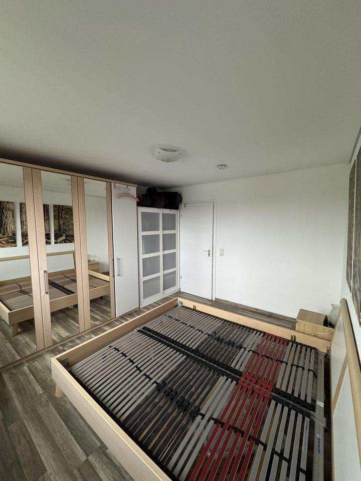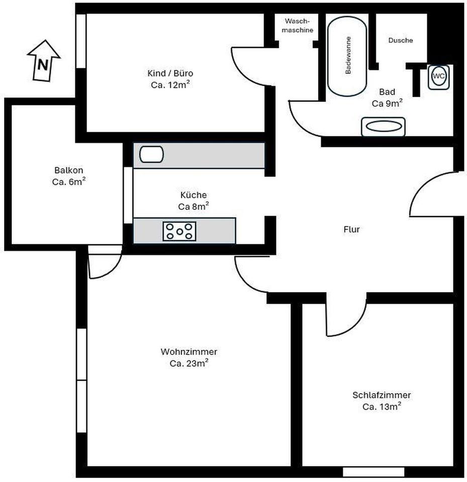 Großzügiger Flur, Schlafzimmer (Südseite mit Außenjalousie), helles Wohnzimmer (Westseite mit Außenjalousie, Plissees, Zugang zum Balkon), Büro/Kinderzimmer (Westseite mit Außenjalousie), Küche (Einbauküche mit Siemens-Geräten, Backofen Whirlpool – im Preis inkl.).