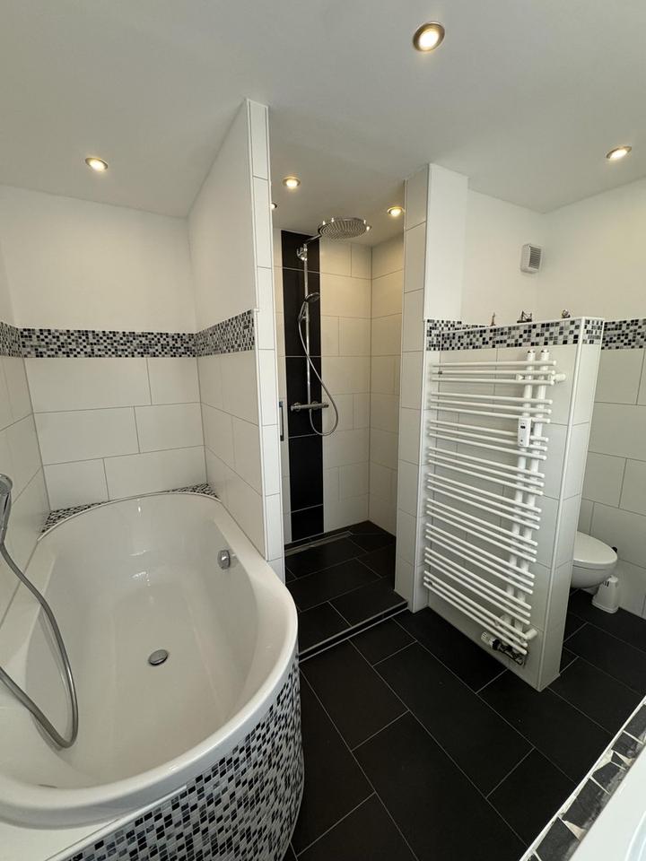 Bad mit Wanne und Dusche (130×90 cm, niedriger Einstieg). Waschmaschine und Trockner im Flur, Stahlschrank als Schuhschrank.