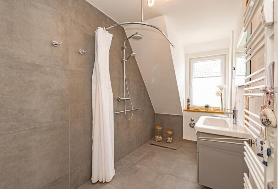 Das Badezimmer wurde 2021 komplett neu gemacht und verfügt über eine ebenerdigen Dusche. Es wurde mit grauem Feinsteinzeug verlegt. Das große Fenster ermöglicht viel Tageslicht und eine gute Durchlüftung.