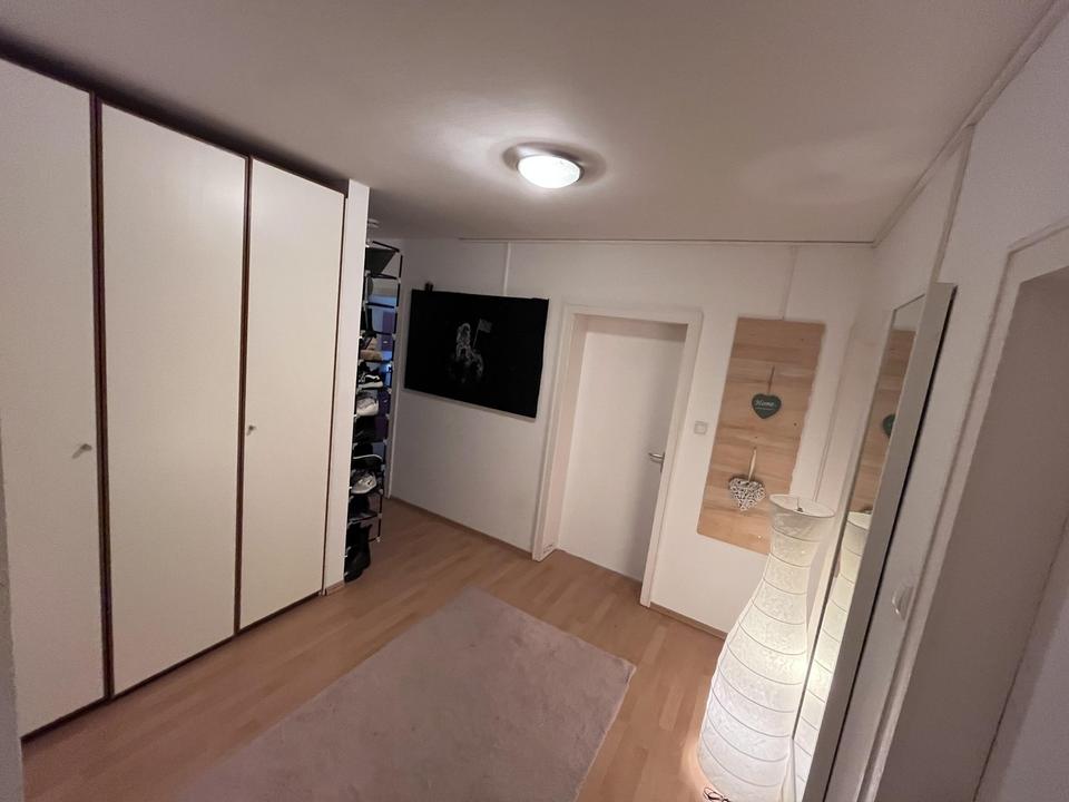 Die Wohnung hat insgesamt 86,6 qm, davon 19,14 qm Wohnzimmer, 14,23 qm Schlafzimmer und 10,62/10,63 die beiden Kinderzimmer. Die Einbauschränke der beiden Kinderzimmer sind vor den jeweiligen Türen im Flur, dadurch sind die Kinderzimmer besser nutzbar. Theoretisch könnten diese Einbauschränke entfernt werden, damit würde der Flur so groß werden, dass man einen Essplatz im Flur einrichten könnte.