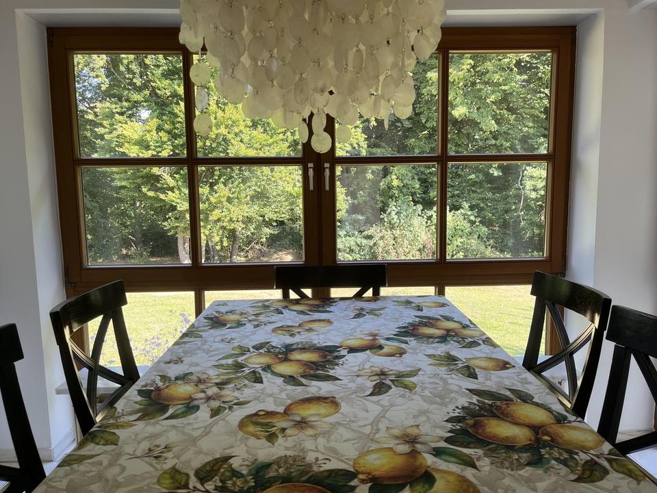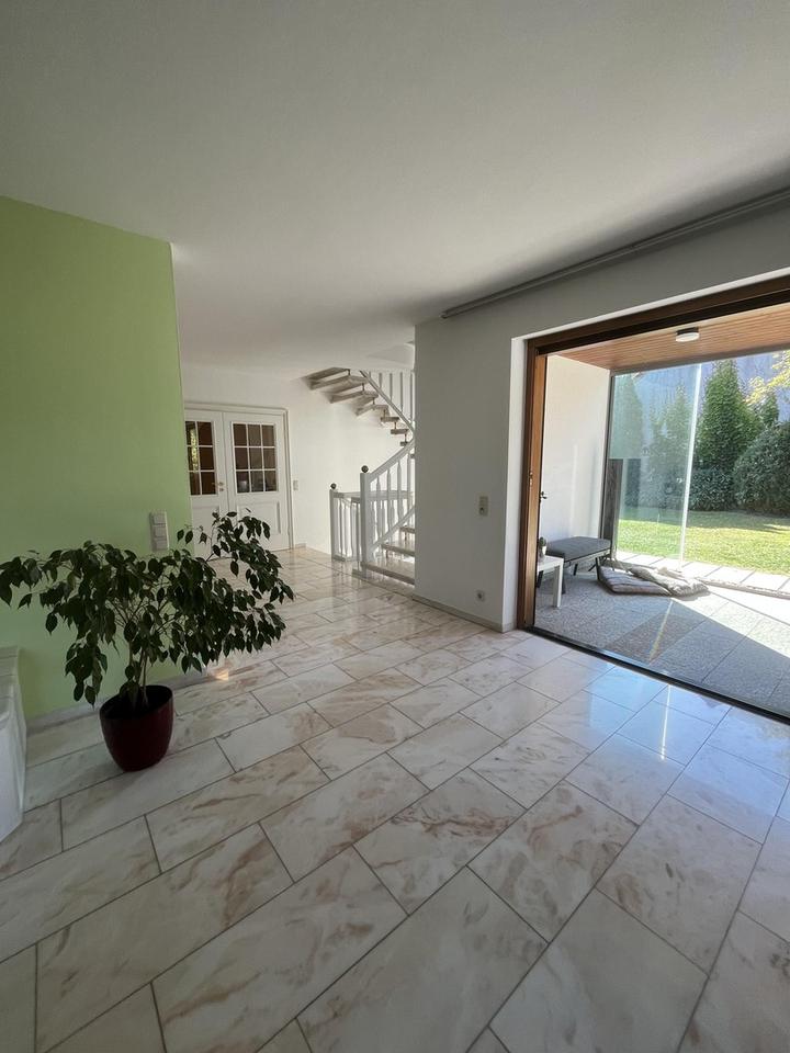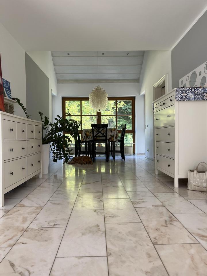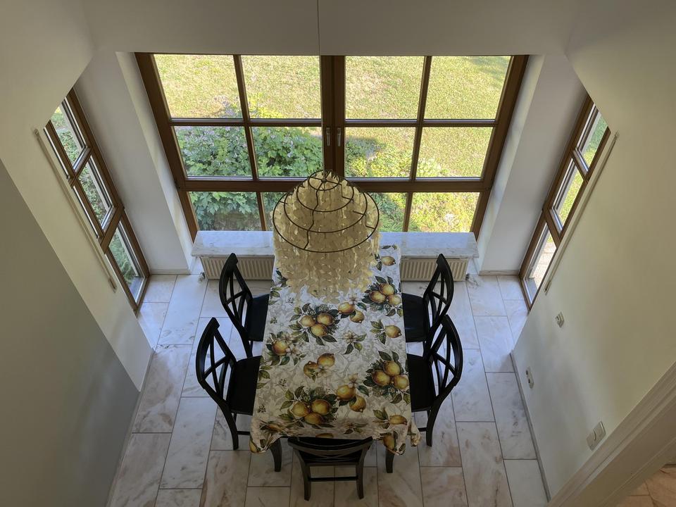 Im Inneren überzeugt das Haus mit viel Licht und Großzügigkeit. Das Erdgeschoss punktet mit edlem Marmorboden, der dem weitläufigen Wohn- und Essbereich eine elegante Atmosphäre verleiht. Große Fensterflächen sorgen für lichtdurchflutete Räume und wunderschöne Gartenblicke. Ein Highlight ist der 2021 ergänzte Wintergarten – Ihr perfekter Platz zum Entspannen zu jeder Jahreszeit. Die nach Westen ausgerichtete Terrasse mit unverbautem Blick garantiert perfekte Sonnenuntergänge.