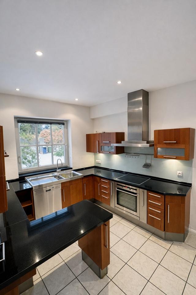 Die Küche ist mit modernen Markengeräten sowie einer hochwertigen Granitarbeitsplatte ausgestattet. Von hier aus gelangen Sie direkt in den Hauswirtschaftsraum mit Waschmaschinenanschluss, separatem Vorrats- und Technikraum sowie praktischem Außenzugang. Ein Gäste- oder Arbeitszimmer ergänzt das Erdgeschoss ideal.