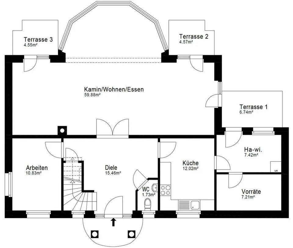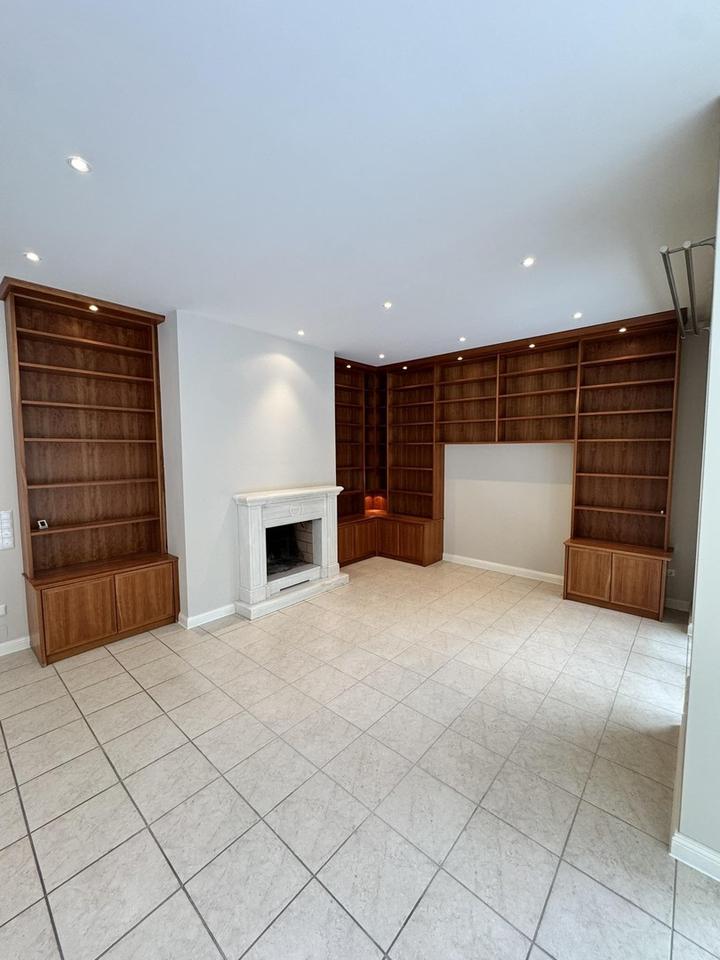 Der repräsentative Wohn- und Essbereich mit ca. 60 m² bildet das Herzstück des Hauses. Bodentiefe Sprossenfenster sorgen für exzellente Lichtverhältnisse, während Fußbodenheizung und ein offener Marmorkamin eine besondere Wohnatmosphäre schaffen. Die großzügige Südterrasse erweitert den Wohnraum harmonisch in den Garten.